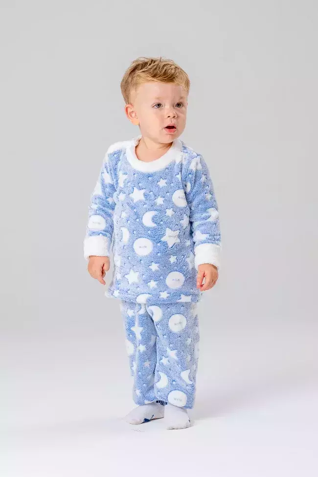 O Pijama infantil Luar é confeccionado em soft fleece, é um material macio e quentinho, um tecido leve, mas capaz de reter o calor, o que o torna ideal para climas frios. Uma das características mais marcantes do fleece é sua textura felpuda, que ajuda a isolar o calor do corpo e proporciona uma sensação de aconchego.